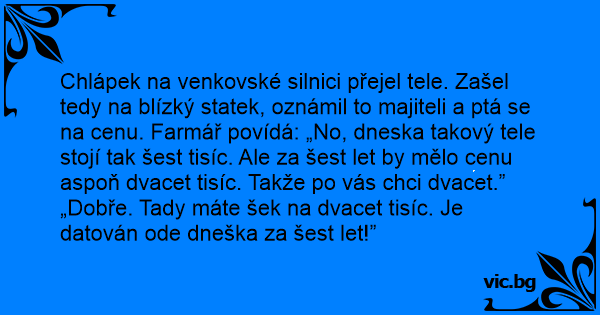 Chlápek na venkovské silnici přejel tele. Zašel tedy na blízký statek, oznámil to majiteli a ptá se na cenu. Farmář povídá: „No, dneska takový tele stojí tak šest tisíc. Ale za šest let by mělo cenu aspoň dvacet tisíc. Takže po vás chci dvacet.”