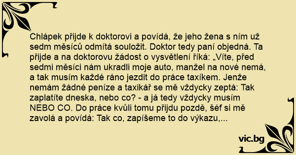 Doktor se na chvíli zamyslí a pak povídá: „No, takže to řekneme manželovi, NEBO CO?”