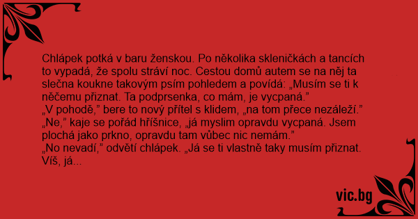 Chlápek potká v baru ženskou. Po několika skleničkách a tancích to vypadá, že spolu stráví noc. Cestou domů autem se na něj ta slečna koukne takovým psím pohledem a povídá: „Musím se ti k něčemu přiznat. Ta podprsenka, co mám, je vycpaná.”