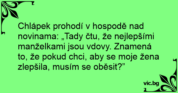 Chlápek prohodí v hospodě nаd novinama: „Tady čtu, že nejlepšími manželkami jsou vdovy. Znamená to, že pokud chci, aby se moje žena zlepšila, musím se oběsit?”