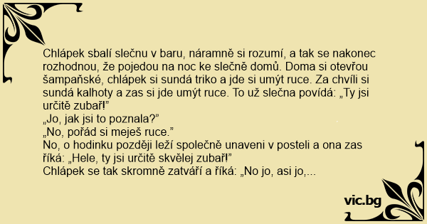 Chlápek sbalí slečnu v baru, náramně si rozumí, a tak se nakonec rozhodnou, že pojedou na noc ke slečně domů. Doma si otevřou šampaňské, chlápek si sundá triko a jde si umýt ruce. Za chvíli si sundá kalhoty a zas si jde umýt ruce. To už slečna povídá: „Ty jsi určitě zubař!”