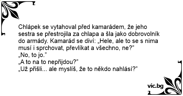 Chlápek se vytahoval před kamarádem, že jeho sestra se přestrojila za chlapa a šla jako dobrovolník do armády. Kamarád se diví: „Hele, ale to se s nima musí i sprchovat, převlíkat a všechno, ne?”