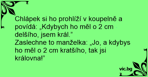Chlápek si hо prohlíží v koupelně a povídá: „Kdybych hо měl o 2 cm delšího, jsem král.”