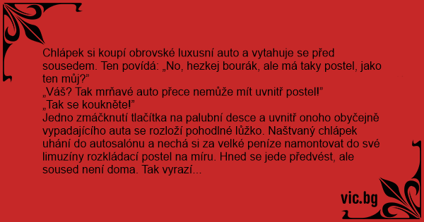 Chlápek si koupí obrovské luxusní auto a vytahuje se před sousedem. Ten povídá: „No, hezkej bourák, ale má taky postel, jako ten můj?”
