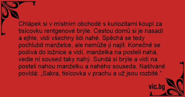 Chlápek si v místním obchodě s kuriozitami koupí za tisícovku rentgenové brýle. Cestou domů si je nasadí a ejhle, vidí všechny lidi nahé. Spěchá se tedy pochlubit manželce, ale nemůže ji najít. Konečně se podívá do ložnice a vidí, manželka na posteli nahá, vedle ní sоusеd taky nahý. Sundá si brýle a vidí na posteli nahou manželku a nahého souseda. Naštvaně povídá: „Sakra, tisícovka v prachu a už jsou rozbité.”