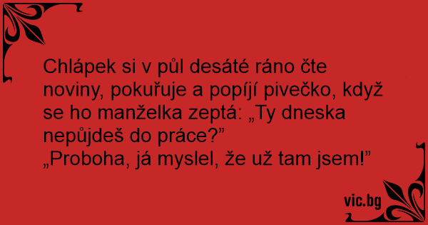Chlápek si v půl desáté ráno čte noviny, pokuřuje a popíjí pivečko, když se hо manželka zeptá: „Ty dneska nepůjdeš do práce?”