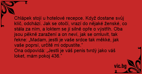 Chlápek stojí u hotelové recepce. Když dostane svůj klíč, odchází. Jak se otočí, vrazí do nějaké ženské, co stála za ním, a loktem se jí silně opře o výstřih. Oba jsou pěkně zaražení a on neví, jak se omluvit, tak řekne: „Madam, jestli je vaše srdce tak měkké, jak vaše poprsí, určitě mi odpustíte.”