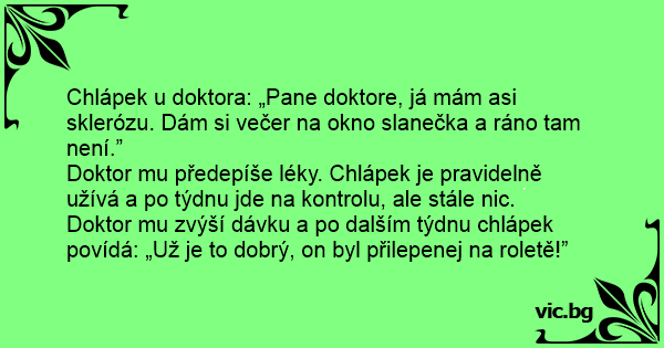 Doktor mu zvýší dávku a po dalším týdnu chlápek povídá: „Už je to dobrý, on byl přilepenej na roletě!”