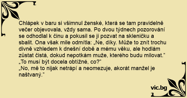 Chlápek v baru si všimnul ženské, která se tam pravidelně večer objevovala, vždy sama. Po dvou týdnech pozorování se odhodlal k činu a pokusil se ji pozvat na skleničku a sbalit. Ona však mile odmítla: „Ne, díky. Může to znít trochu divně vzhledem k dnešní době a mému věku, ale hodlám zůstat čistá, dokud nepotkám muže, kterého budu milovat.”
