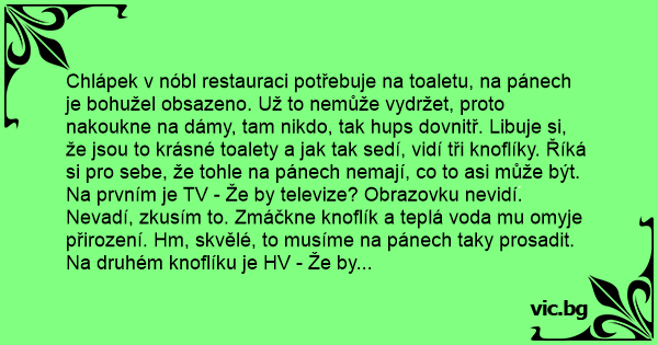 Chlápek v nóbl restauraci potřebuje na toaletu, na pánech je bohužel obsazeno. Už to nemůže vydržet, proto nakoukne na dámy, tam nikdo, tak hups dovnitř. Libuje si, že jsou to krásné toalety a jak tak sedí, vidí tři knoflíky. Říká si pro sebe, že tohle na pánech nemají, co to asi může být.