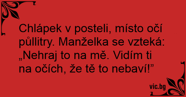 Chlápek v posteli, místo očí půllitry. Manželka se vzteká: „Nehraj to na mě. Vidím ti na očích, že tě to nebaví!”