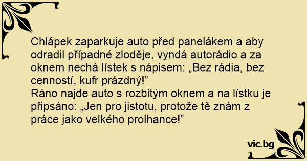 Ráno najde auto s rozbitým oknem a na lístku je připsáno: „Jen pro jistotu, protože tě znám z práce jako velkého prolhance!”