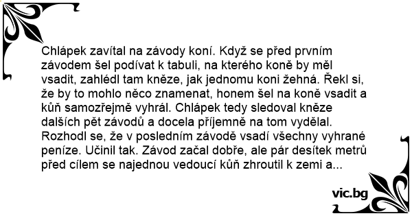Chlápek zavítal na závody koní. Když se před prvním závodem šel podívat k tabuli, na kterého koně by měl vsadit, zahlédl tam kněze, jak jednomu koni žehná. Řekl si, že by to mohlo něco znamenat, honem šel na koně vsadit a kůň samozřejmě vyhrál. Chlápek tedy sledoval kněze dalších pět závodů a docela příjemně na tom vydělal. Rozhodl se, že v posledním závodě vsadí všechny vyhrané peníze. Učinil tak. Závod začal dobře, ale pár desítek metrů před cílem se najednou vedoucí kůň zhroutil k zemi a byl na místě mrtvý. Chlápka to pěkně dožralo a běžel za tím knězem žádat vysvětlení. Ten pouze smutně zakýval hlavou a povídá: „No jo, s vámi nevěřícími je problém. Vy zkrátka nepoznáte rozdíl mezi požehnáním a posledním pomazáním!”