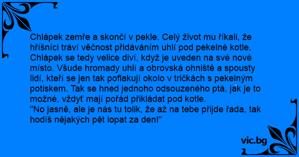 Chlápek zemře a skončí v pekle. Celý život mu říkali, že hříšníci tráví věčnost přidáváním uhlí pod pekelné kotle. Chlápek se tedy velice diví, když je uveden na své nové místo. Všude hromady uhlí a obrovská ohniště a spousty lidí, kteří se jen tak poflakují okolo v tričkách s pekelným potiskem. Tak se hned jednoho odsouzeného ptá, jak je to možné, vždyť mají pořád přikládat pod kotle.