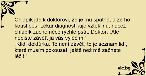 Chlapík jde k doktorovi, že je mu špatně, a že hо kousl pes. Lékař diagnostikuje vzteklinu, načež chlapík začne něco rychle psát. Doktor: „Ale nepište závěť, já vás vyléčím.”