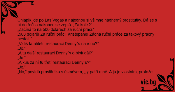 Chlapík jde po Las Vegas a najednou si všimne nádherný prostitutky. Dá se s ní do řeči a nakonec se zeptá: „Za kolik?”