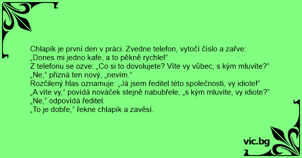 Chlapík je první den v práci. Zvedne telefon, vytočí číslo a zařve: „Dones mi jedno kafe, a to pěkně rychle!” Z telefonu se ozve: „Co si to dovolujete? Víte vy vůbec, s kým mluvíte?” „Ne,” přizná ten nový, „nevím.” Rozčilený hlas oznamuje: „Já jsem ředitel této společnosti, vy idiote!” „A víte vy,” povídá nováček stejně nabubřele, „s kým mluvíte, vy idiote?” „Ne,” odpovídá ředitel. „To je dobře,” řekne chlapík a zavěsí.
