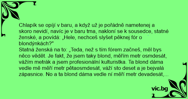 Chlapík se opíjí v baru, a když už je pořádně nametenej a skoro nevidí, navíc je v baru tma, nakloní se k sousedce, statné ženské, a povídá: „Hele, nechceš slyšet pěknej fór o blondýnkách?"