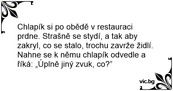 Chlapík si po obědě v restauraci prdne. Strašně se stydí, a tak aby zakryl, co se stalo, trochu zavrže židlí. Nahne se k němu chlapík odvedle a říká: „Úplně jiný zvuk, co?”