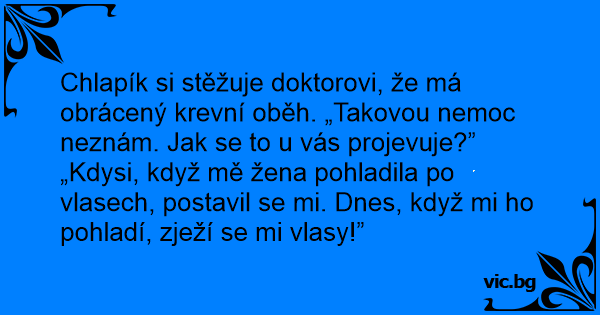 Chlapík si stěžuje doktorovi, že má obrácený krevní oběh. „Takovou nemoc neznám. Jak se to u vás projevuje?”