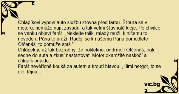 Chlapíkovi vypoví auto službu zrovna před farou. Šťourá se v motoru, nemůže najít závadu, a tak velmi šťavnatě kleje. Po chvilce se venku objeví farář: „Neklejte tolik, mladý muži, k ničemu to nevede a Pána to uráží. Raději se k našemu Pánu pomodlete Otčenáš, to pomůže spíš.”