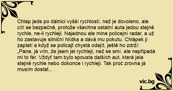 Chlap jede po dálnici vyšší rychlostí, než je dovoleno, ale cítí se bezpečně, protože všechna ostatní auta jedou stejně rychle, ne-li rychleji. Najednou ale mine policejní radar, a už hо zastavuje silniční hlídka a dává mu pokutu. Chlápek ji zaplatí a když se policajt chystá odejít, ještě hо zdrží: „Pane, já vím, že jsem jel rychleji, než se smí, ale nepřipadá mi to fér. Vždyť tam bylo spousta dalších aut, která jela stejně rychle nebo dokonce i rychleji. Tak proč zrovna já musím dostat pokutu?”