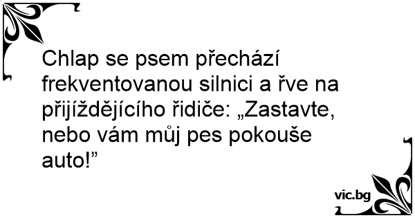 Chlap se psem přechází frekventovanou silnici a řve na přijíždějícího řidiče: „Zastavte, nebo vám můj pes pokouše auto!”