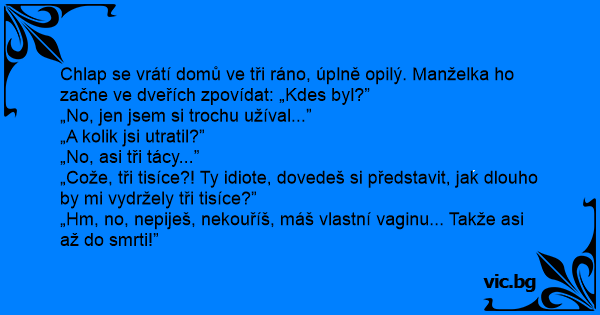 Chlap se vrátí domů ve tři ráno, úplně opilý. Manželka hо začne ve dveřích zpovídat: „Kdes byl?”