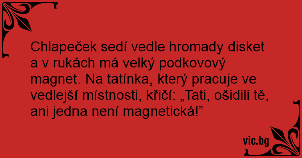 Chlapeček sedí vedle hromady disket a v rukách má velký podkovový magnet. Na tatínka, který pracuje ve vedlejší místnosti, křičí: „Tati, ošidili tě, ani jedna není magnetická!”