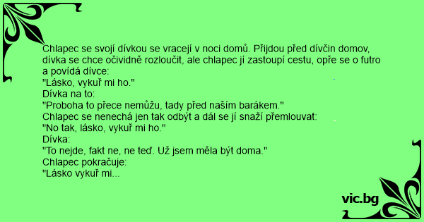 "Tatínek ti vzkazuje, že mu hо máš vykouřit nebo mu hо mám vykouřit já, hlavně ať ten kretén dá tu ruku z toho zvonku.