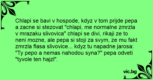 Chlapi se bavi v hospode, kdyz v tom prijde pepa a zacne si stezovat "chlapi, me normalne zmrzla v mrazaku slivovica" chlapi se divi, rikaji ze to neni mozne, ale pepa si stoji za svym, ze mu fakt zmrzla flasa slivovice... kdyz tu napadne jarosa: