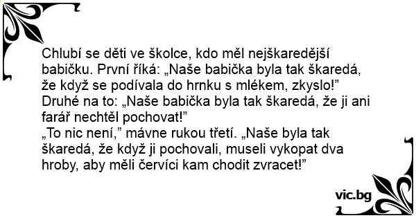 Chlubí se děti ve školce, kdo měl nejškaredější babičku. První říká: „Naše babička byla tak škaredá, že když se podívala do hrnku s mlékem, zkyslo!”