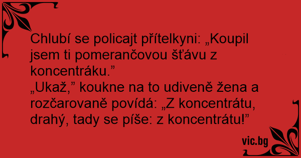 „Ukaž,” koukne na to udiveně žena a rozčarovaně povídá: „Z koncentrátu, drahý, tady se píše: z koncentrátu!”