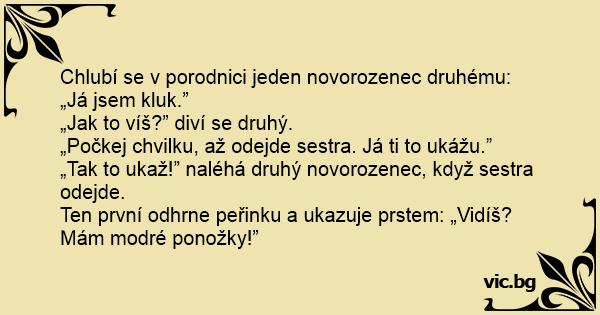 Två bäbisar ligger och pratar på BB. – Vet du.. Jag är en pojke. – Hur vet du det? Då lyfter han sakta på täcket… – Kolla! Blå sockar!
