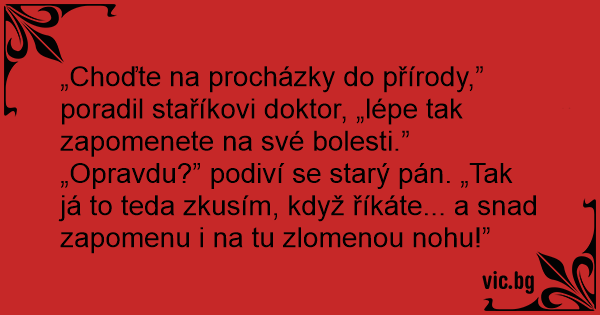 „Choďte na procházky do přírody,” poradil staříkovi doktor, „lépe tak zapomenete na své bolesti.”