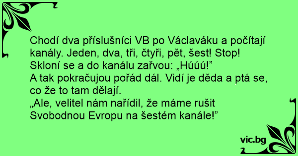 Chodí dva příslušníci VB po Václaváku a počítají kanály. Jeden, dva, tři, čtyři, pět, šest! Stop! Skloní se a do kanálu zařvou: „Húúú!”