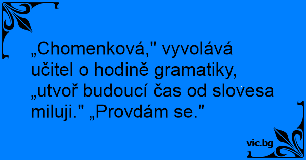 „Chomenková," vyvolává učitel o hodině gramatiky, „utvoř budoucí čas od slovesa miluji." „Provdám se."