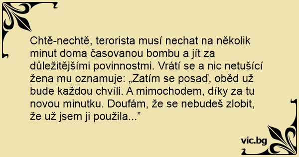 Chtě-nechtě, terorista musí nechat na několik minut doma časovanou bombu a jít za důležitějšími povinnostmi. Vrátí se a nic netušící žena mu oznamuje: „Zatím se posaď, oběd už bude každou chvíli. A mimochodem, díky za tu novou minutku. Doufám, že se nebudeš zlobit, že už jsem ji použila...”