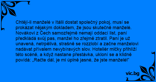Chtějí-li manželé v Itálii dostat společný pokoj, musí se prokázat nějakým dokladem, že jsou skutečně manželé. Novákovi z Čech samozřejmě nemají oddací list, paní předkládá svůj pas, manžel hо zřejmě ztratil. Paní je už unavená, netrpělivá, strašně se rozzlobí a začne manželovi nadávat přívalem nevybíravých slov. Hoteliér mlčky přihlíží této scéně, a když nastane přestávka, ukloní se a klidně povídá: „Račte dál, je mi úplně jasné, že jste manželé!”
