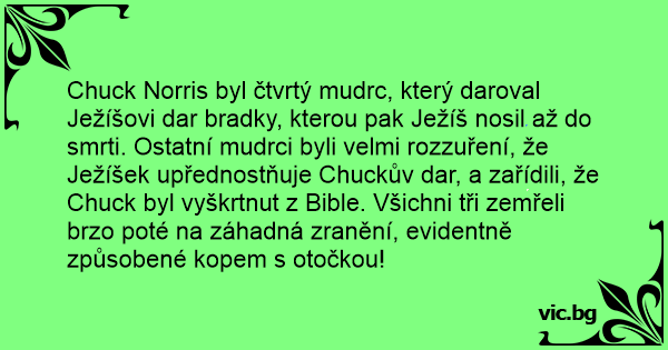Chuck Norris byl čtvrtý mudrc, který daroval Ježíšovi dar bradky, kterou pak Ježíš nosil až do smrti. Ostatní mudrci byli velmi rozzuření, že Ježíšek upřednostňuje Chuckův dar, a zařídili, že Chuck byl vyškrtnut z Bible. Všichni tři zemřeli brzo poté na záhadná zranění, evidentně způsobené kopem s otočkou!