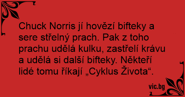 Chuck Norris jí hovězí bifteky a sere střelný prach. Pak z toho prachu udělá kulku, zastřelí krávu a udělá si další bifteky. Někteří lidé tomu říkají „Cyklus Života“.