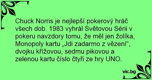 Chuck Norris je nejlepší pokerový hráč všech dob. 1983 vyhrál Světovou Sérii v pokeru navzdory tomu, že měl jen žolíka, Monopoly kartu „Jdi zadarmo z vězení“, dvojku křížovou, sedmu pikovou a zelenou kartu číslo čtyři ze hry UNO.