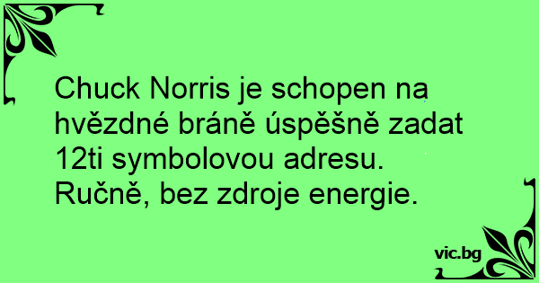 Chuck Norris je schopen na hvězdné bráně úspěšně zadat 12ti symbolovou adresu. Ručně, bez zdroje energie.