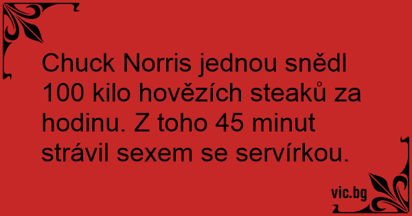 Chuck Norris jednou snědl 100 kilo hovězích steaků za hodinu. Z toho 45 minut strávil sexem se servírkou.