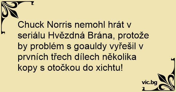 Chuck Norris nemohl hrát v seriálu Hvězdná Brána, protože by problém s goauldy vyřešil v prvních třech dílech několika kopy s otočkou do xichtu!