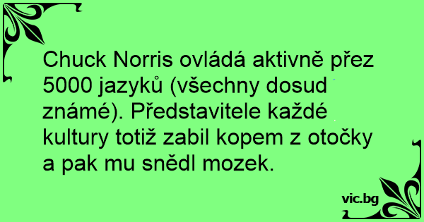 Chuck Norris ovládá aktivně přez 5000 jazyků (všechny dosud známé). Představitele každé kultury totiž zabil kopem z otočky a pak mu snědl mozek.
