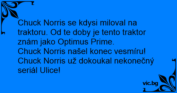Chuck Norris se kdysi miloval na traktoru. Od te doby je tento traktor znám jako Optimus Prime.