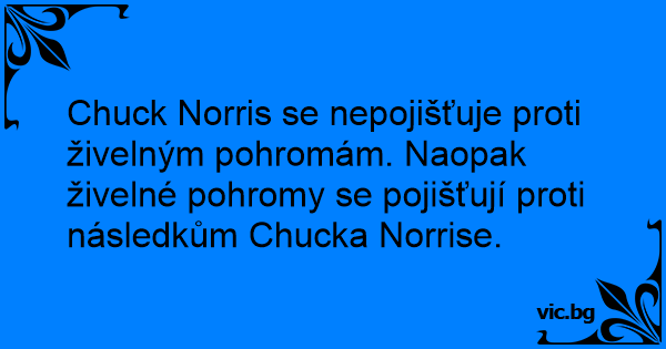 Chuck Norris se nepojišťuje proti živelným pohromám. Naopak živelné pohromy se pojišťují proti následkům Chucka Norrise.