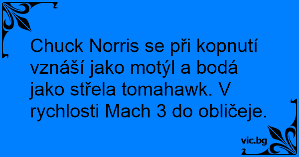 Chuck Norris se při kopnutí vznáší jako motýl a bodá jako střela tomahawk. V rychlosti Mach 3 do obličeje.