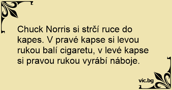 Chuck Norris si strčí ruce do kapes. V pravé kapse si levou rukou balí cigaretu, v levé kapse si pravou rukou vyrábí náboje.